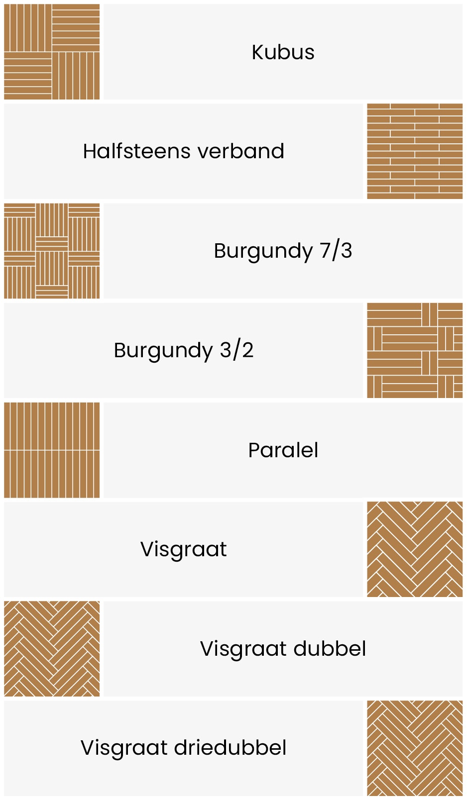 Met een ruime keuze aan patronen, van klassiek visgraat tot speelse kubus- en burgundyvarianten, biedt mozaïekparket volop ontwerpmogelijkheden. Hierdoor is deze vloer geschikt voor zowel moderne als traditionele interieurs.