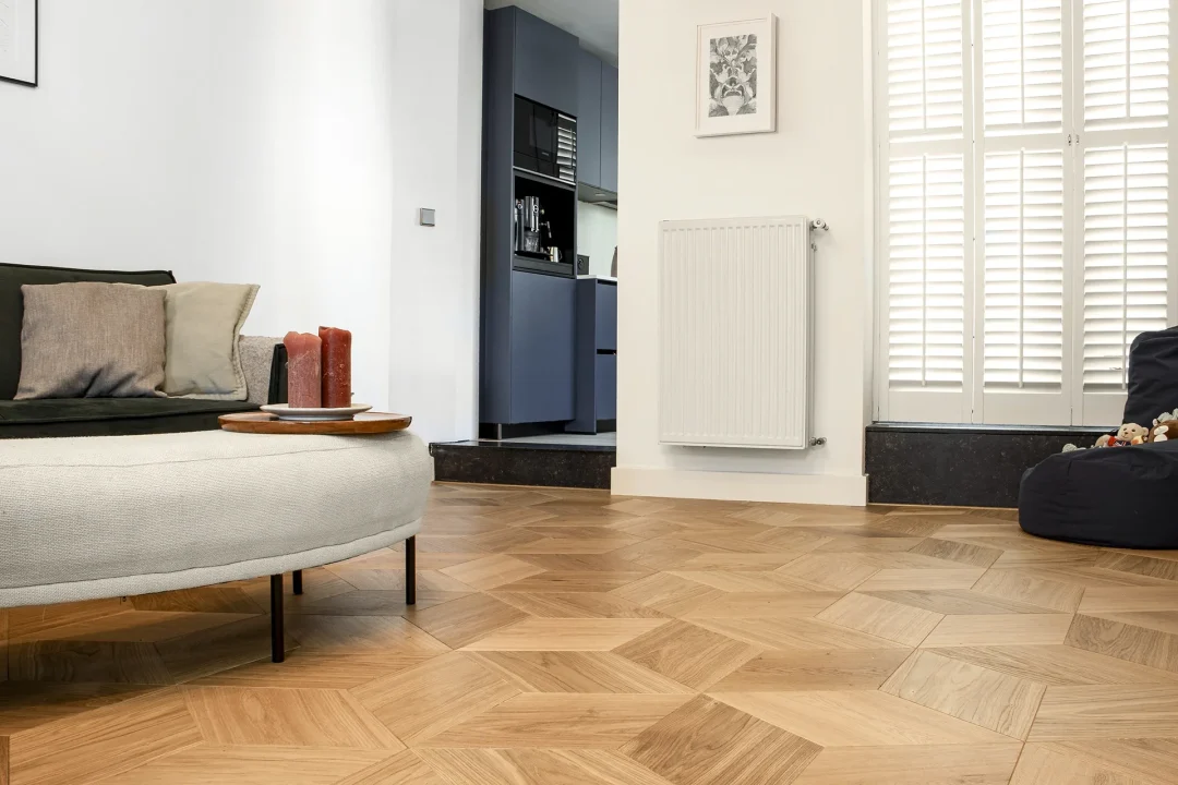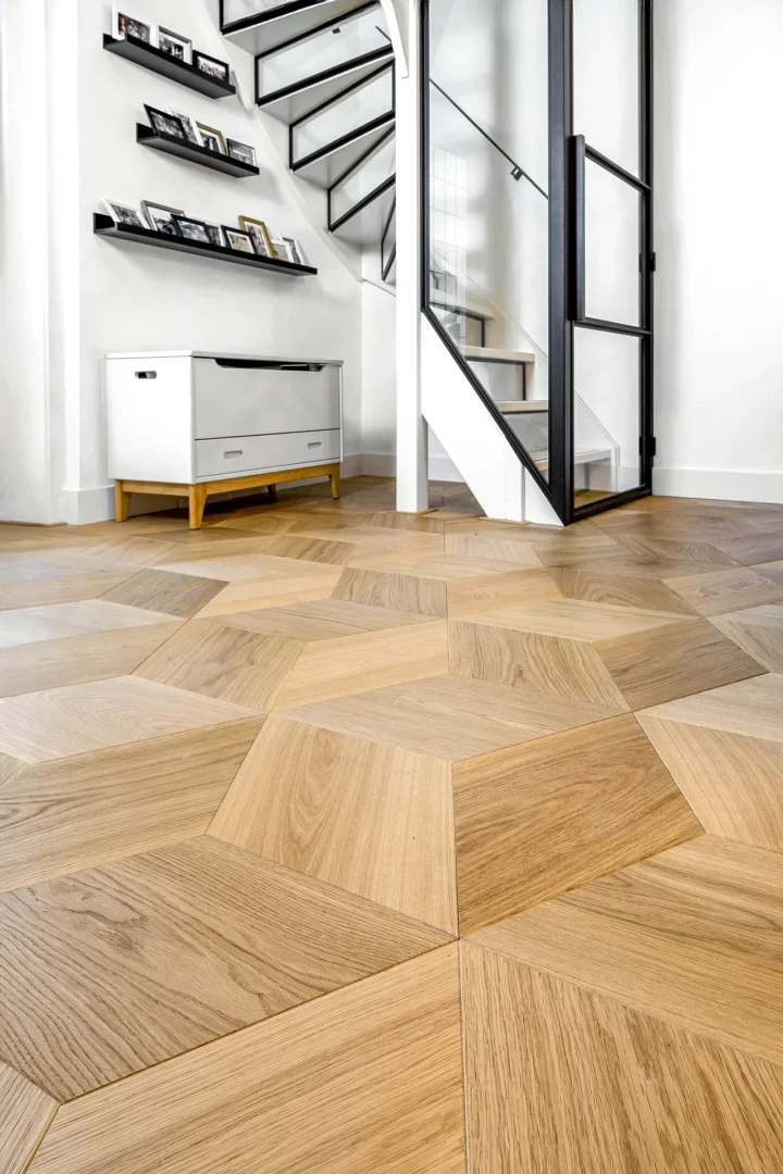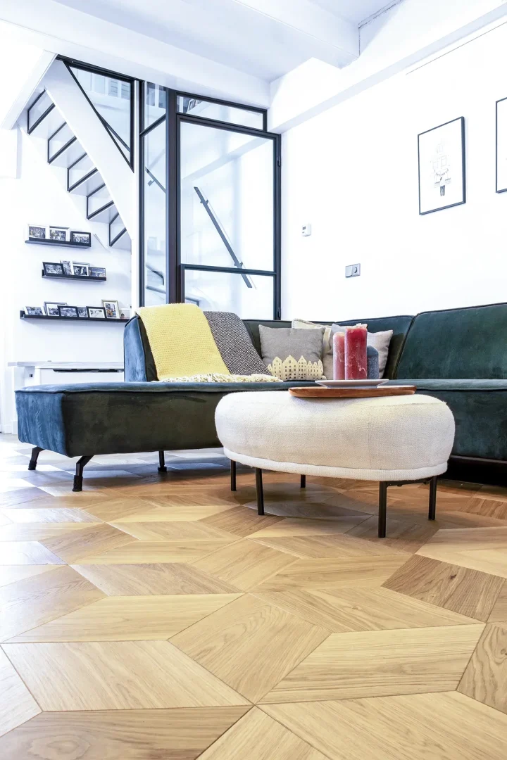Deze woning is voorzien van een houten vloer in het 3D Cube patroon, een klassiek kubusmotief dat een optisch 3D-effect creëert. De vloer is geproduceerd in een 1-Bis sortering, waardoor het oppervlak vrijwel vrij is van noesten en een rustige uitstraling krijgt. Het is ook mogelijk om ieder deel van de 3D Cube een andere kleur te geven, dit geef een nog duidelijker 3D-effect.