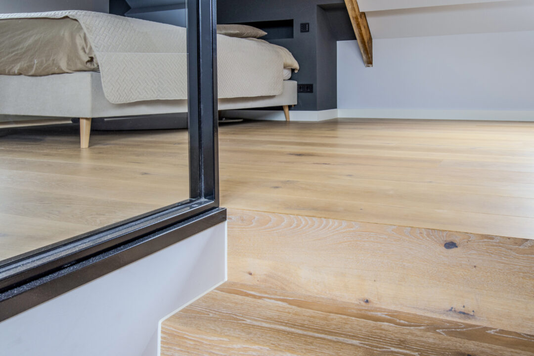 In dit project is een houten vloer geïnstalleerd met planken die een dikte van 15/4 mm en een breedte van 180 mm bevatten. Elke plank hebben we met zorg geborsteld, waardoor de natuurlijke structuur van het hout tot leven komt en een unieke uitstraling krijgt. De subtiele grijze gloed, verkregen door de behandeling met Monocoat Smoke kleurolie, voegt een vleugje moderniteit toe aan de klassieke warmte van het hout.